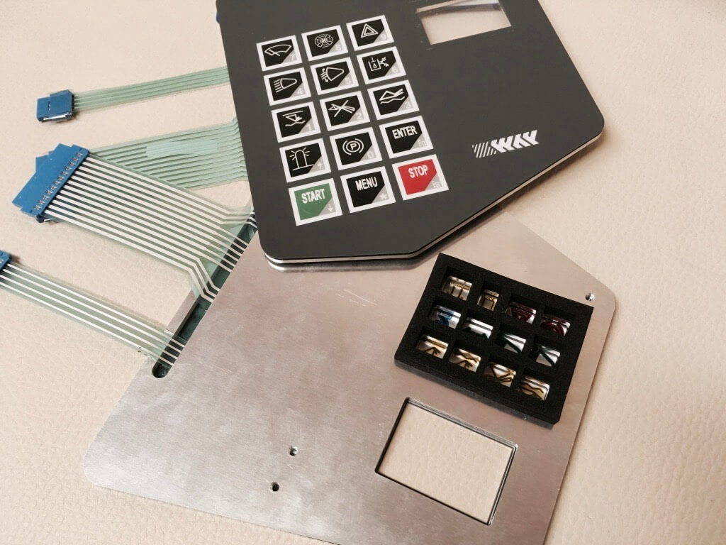 Folientastatur auf einem Aluminiumbrett mit bestückten Schrauben, Display-Glasabdeckung und Dichtung wird z. B. beim Kunden mit 6 Muttern befestigt, was mit der Installation von Einzelteilen nicht vergleichbar ist.